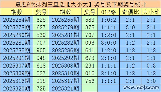 1.陈列三第2025320期奖号开出725,大小直选分散为:大小大,在历史开奖中直选【大小大】分散已开出940期,在前9次直选【大小大】分散中,出现奖号为:628-627-539-707-905-948-618-527-918,组三开出1期,组六开出8期。